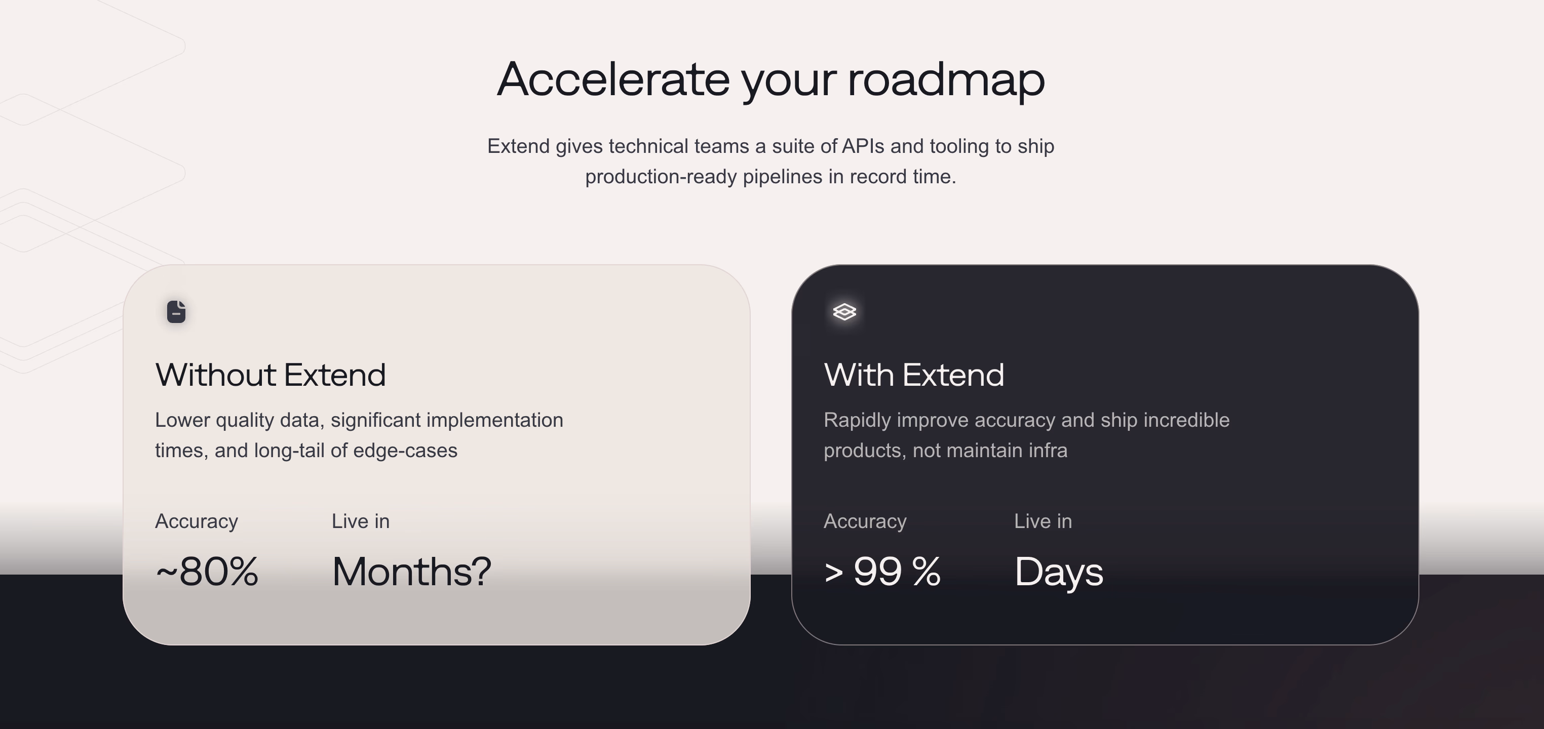 Modern LLM-powered platforms show that 99%+ accuracy on complex documents is achievable from day one. Unlike legacy OCR systems that demand months of setup and endless fine-tuning, Extend delivers production-ready results within days, adapting to the unpredictability of real business workflows. The difference in accuracy, deployment speed, and ongoing maintenance costs will compound quickly once you're processing real volumes.
