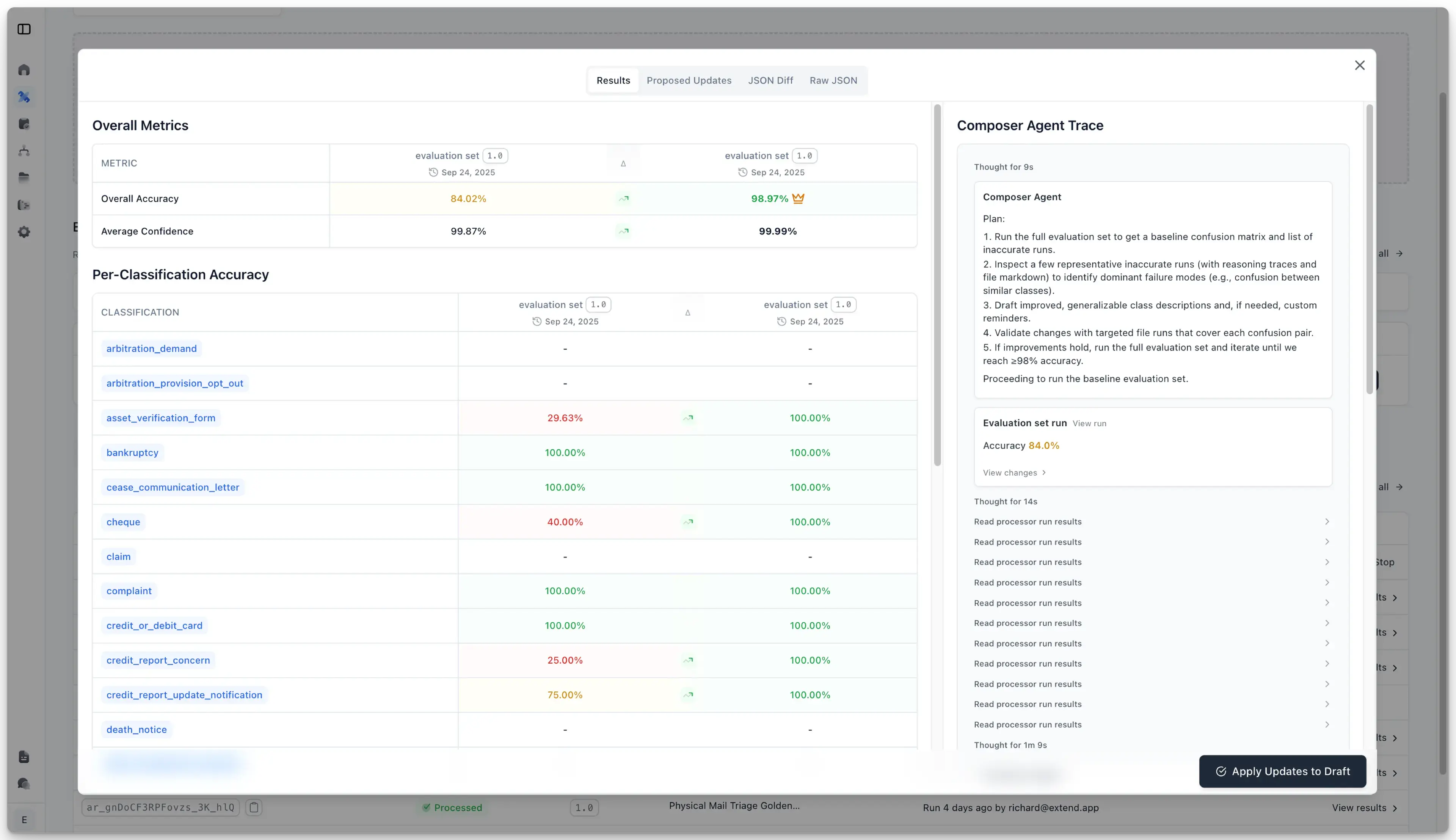 Once reviewed, you can apply Composer’s draft updates to your schema with a single click. What used to require weeks of prompt tuning and regression chasing is now a repeatable background process.