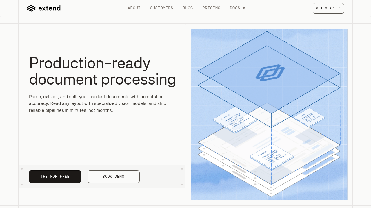 Extend is the complete document processing toolkit comprised of the most accurate parsing, extraction, and splitting APIs to ship your hardest use cases in minutes, not months. Extend's suite of models, infrastructure, and tooling is the most powerful custom document solution, without any of the overhead. Agents automate the entire lifecycle of document processing, allowing engineering teams to process their most complex documents and optimize performance at scale.