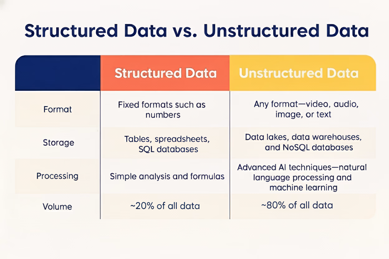 The numbers tell a stark story. More than 80% of business data exists in unstructured formats, and large organizations generally produce about four times as much unstructured data as structured data.
