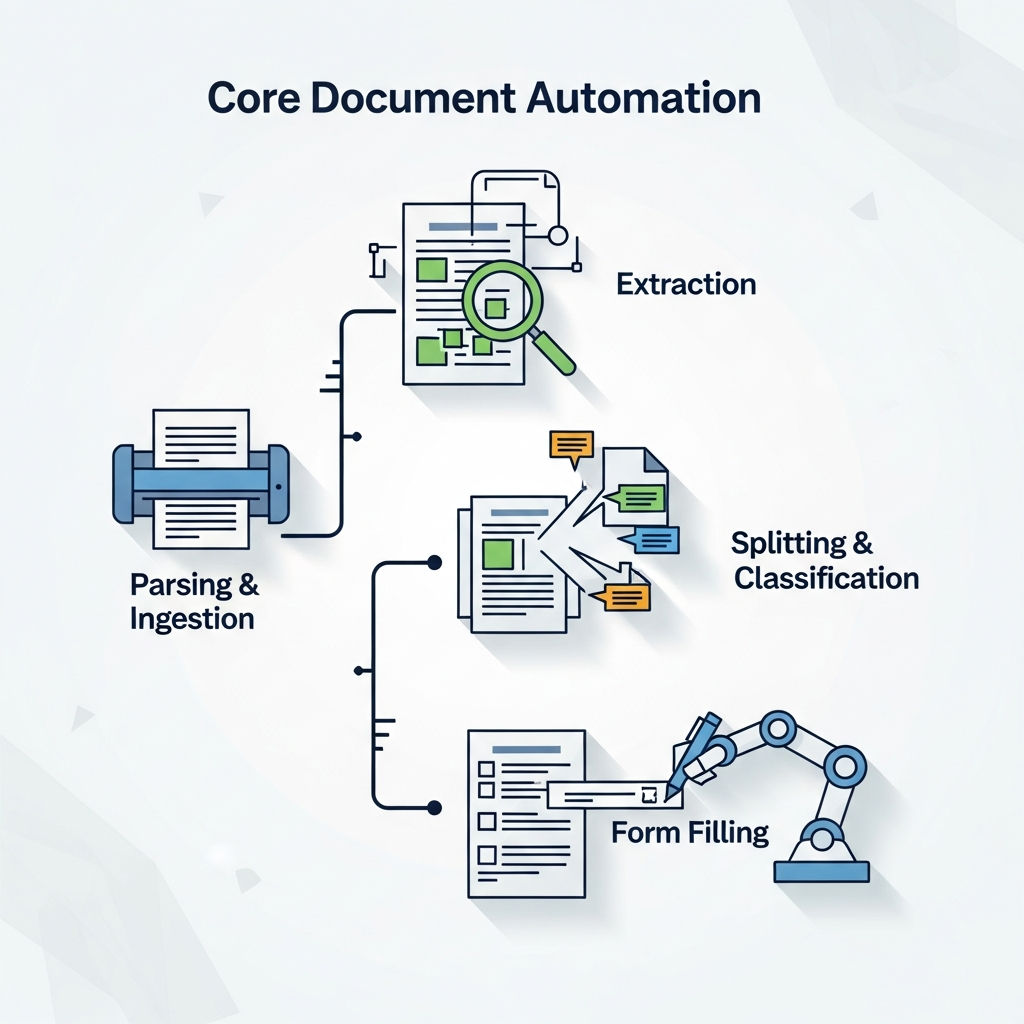 The order matters. Extraction accuracy depends on clean parsing. Splitting has to happen before extraction or data gets pulled from the wrong document. Each capability feeds the next.