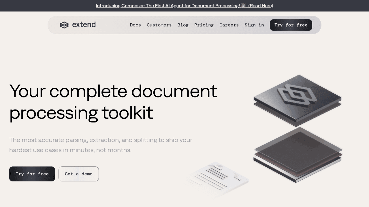 Extend: A end-to-end platform for building, iterating, evaluating, and deploying document processing infrastructure with best-in-class APIs for parsing, extraction, classification, and splitting, along with an integrated evaluation suite, schema/config versioning, human-in-the-loop Review UI, and an optimization agent (Composer).
