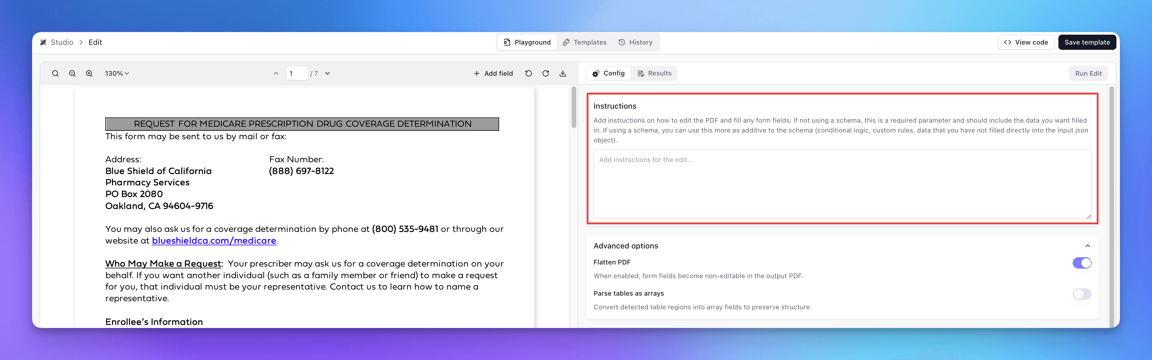 In this mode, you submit a PDF along with natural language instructions describing how to fill it. Edit analyzes the document on the fly, detects form elements, and fills them based on your instructions. No schema required. No pre-configuration. Just a PDF and a prompt.
