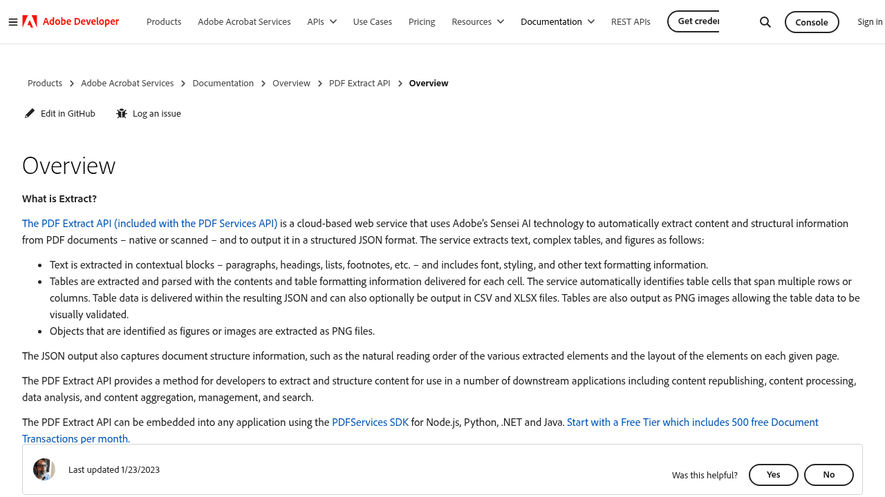 Adobe PDF Extract API extracts text, tables, and images from PDFs into structured JSON, powered by Adobe Sensei's machine learning.
