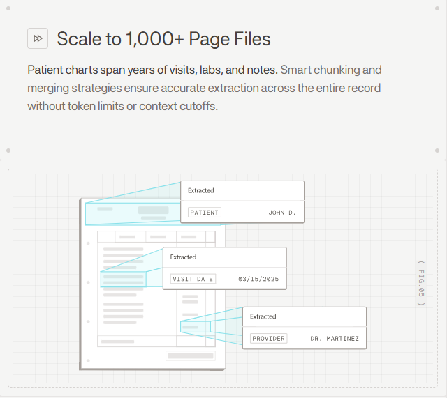 Processing patient charts presents technical challenges when records span hundreds or thousands of pages. Document processing systems must parse dense layouts like progress notes, lab reports, and medication lists across lengthy files.