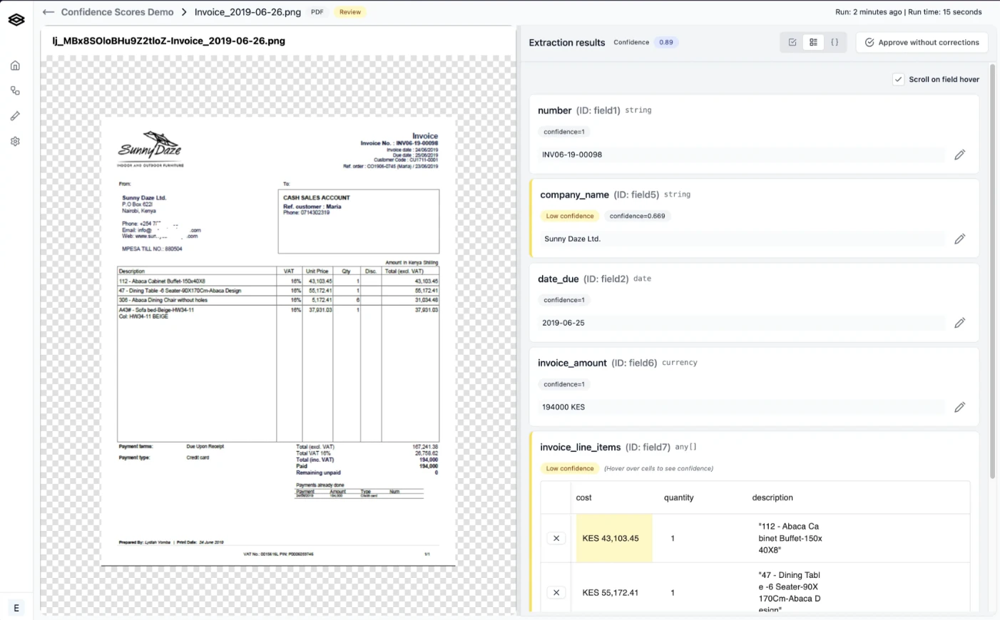 Fields scoring below 0.85 confidence typically get flagged for human review, though teams should calibrate thresholds against their specific accuracy requirements and review capacity to balance automation rates with acceptable error tolerance.