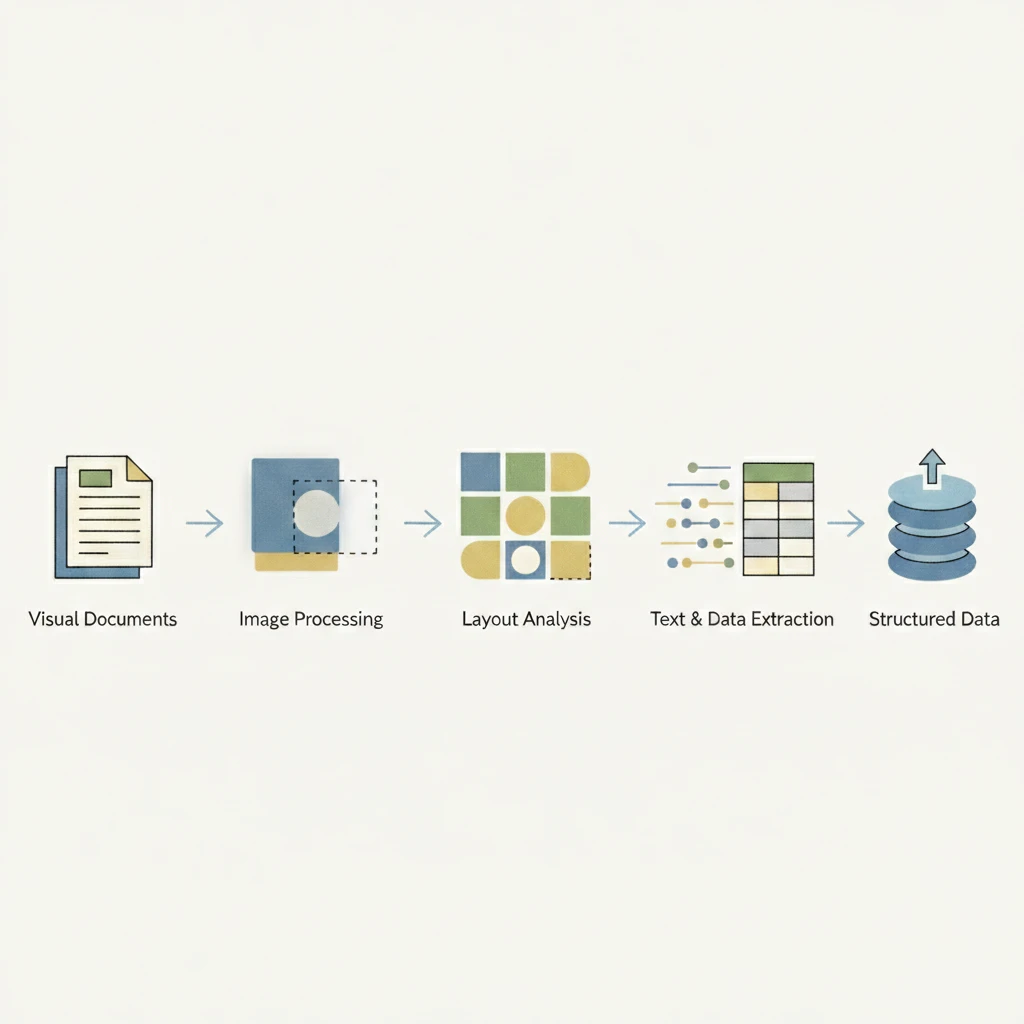 PDF extraction follows a multi-stage pipeline that converts visual documents into structured data. Each stage builds on the previous one, progressively transforming pixels into usable information.