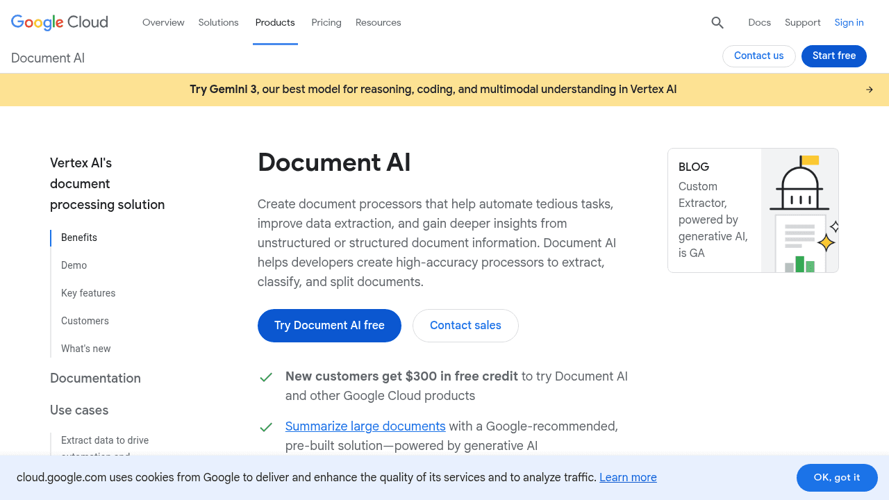 Google Document AI is a document processing service that leverages AI to extract structured and unstructured data from various document types. The platform provides prebuilt processors for common business documents alongside custom processor training capabilities. Integration with Google Cloud services including BigQuery, Cloud Storage, and Vertex AI enables document processing within existing GCP infrastructure. The service supports over 50 languages with layout-aware extraction and handwriting recognition.