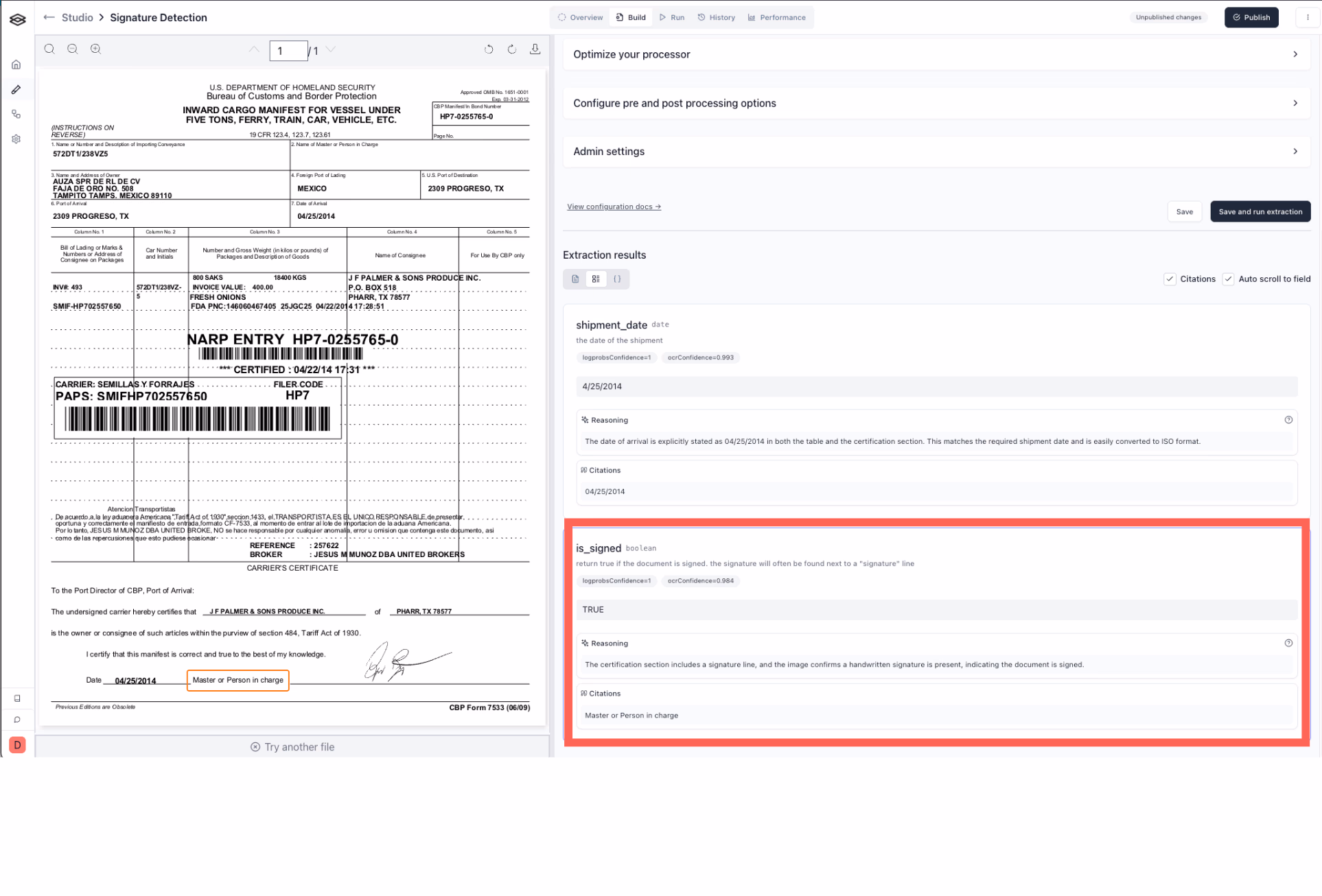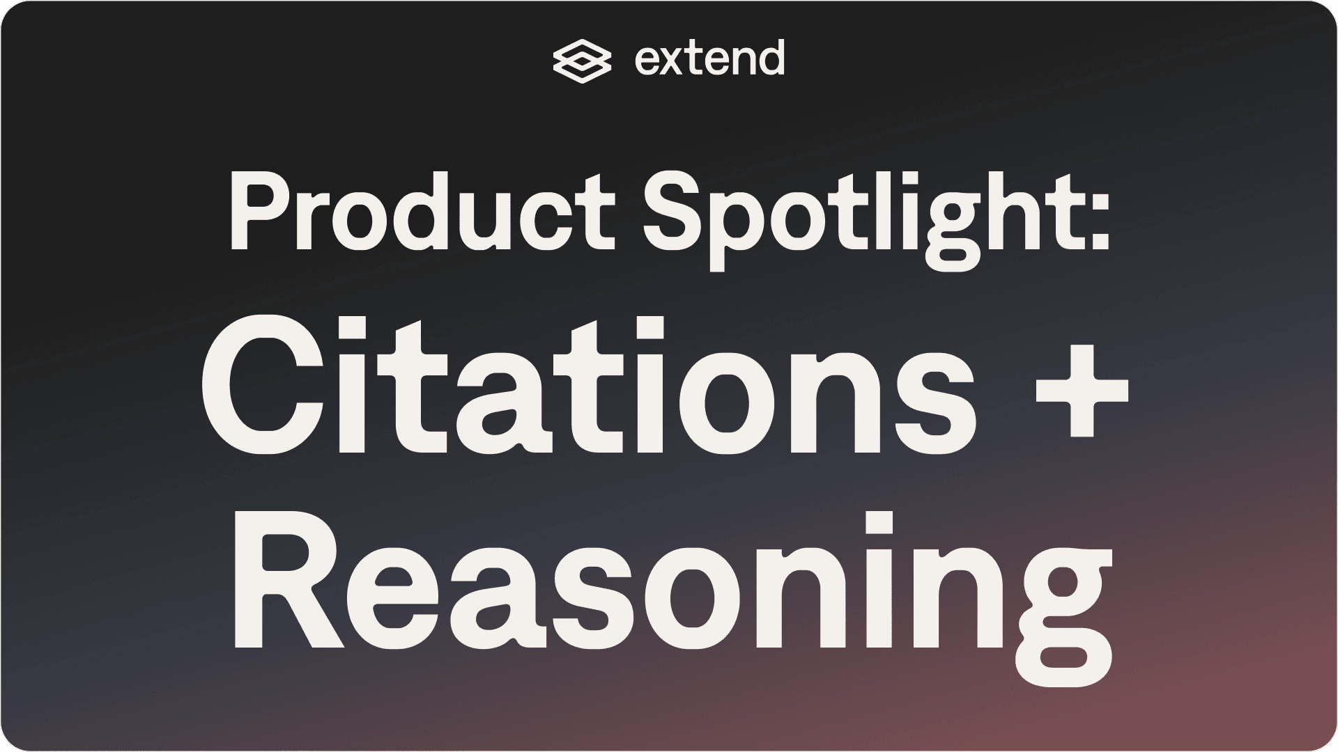 At a high level, citations & reasoning in Extend are tools for grounding model outputs back to their sources. For every extracted value, field level bounding boxes will show where in the document that value was found. In more complex cases, reasoning metadata explains why the model arrived at that output.