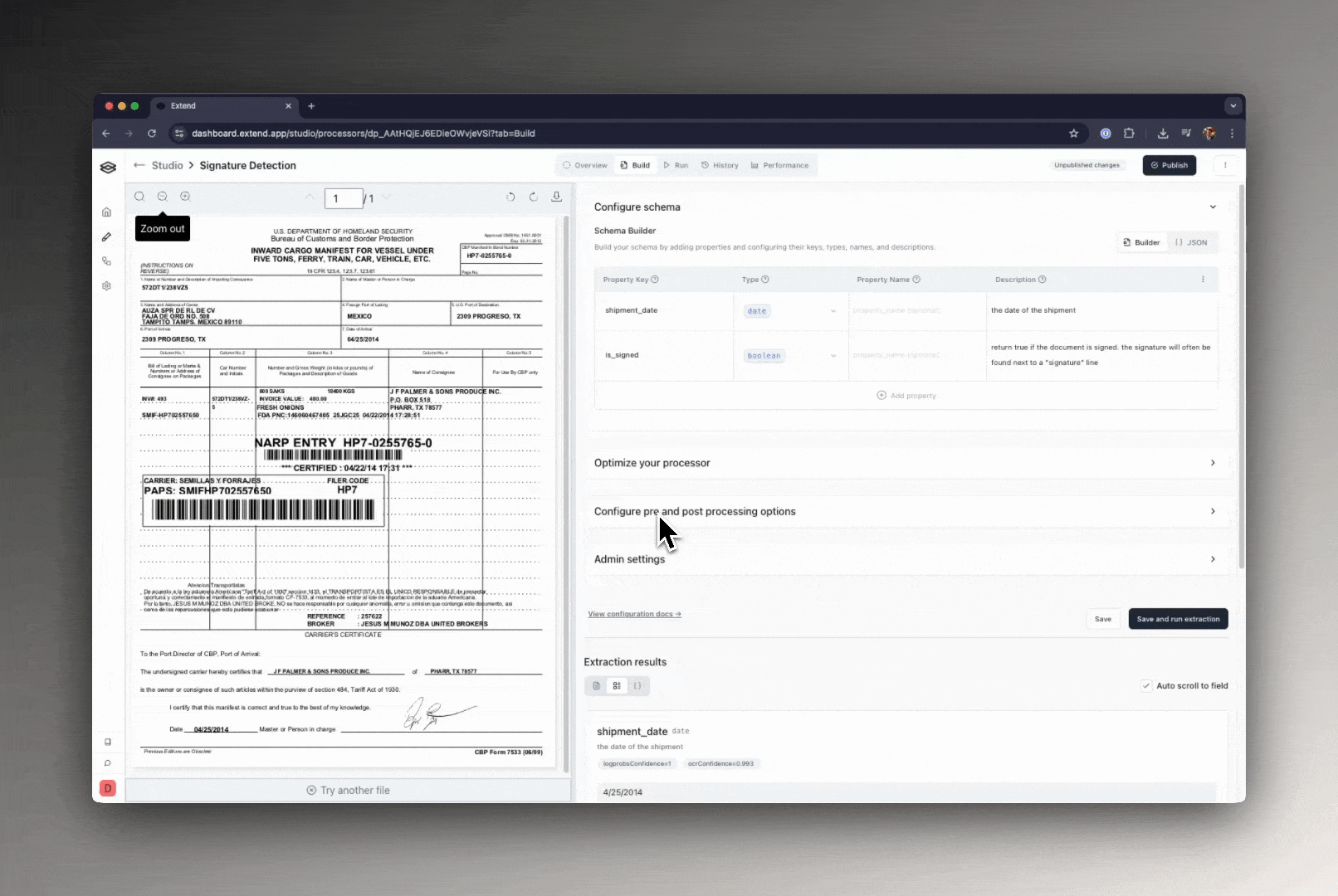 For internal review teams, citations accelerate the verification & approval process. Instead of hunting through a PDF to review an output, Extend will snap to the relevant page, highlight the specific coordinates, and explain why the model arrived at the extracted value.