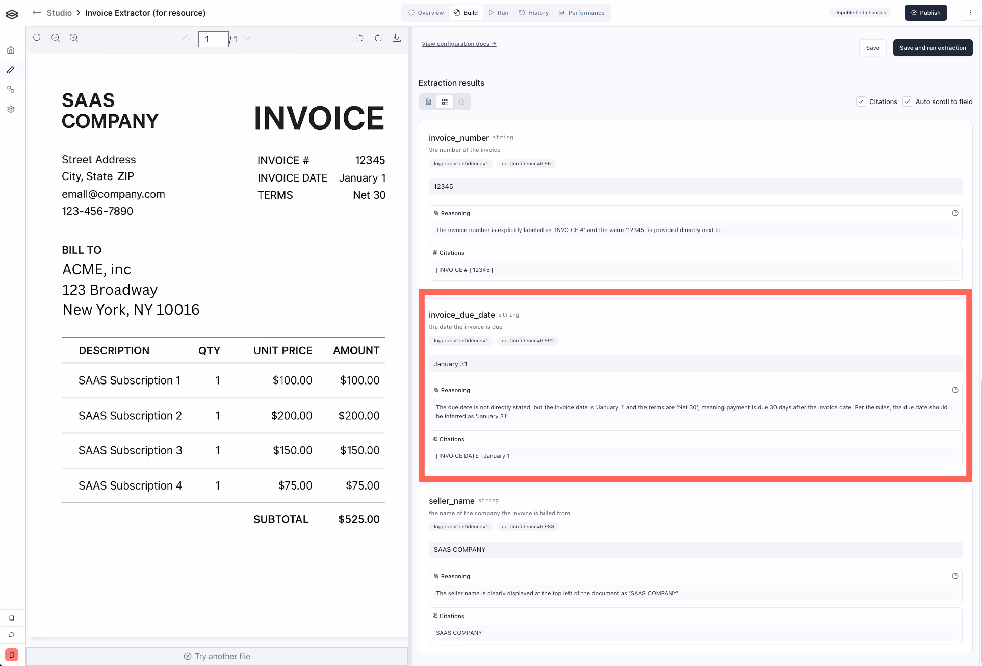 With citations and reasoning enabled, as well as custom extraction rules, the model links the due date value to both the “January 1” and “Net 30” fields, and explain the inferred calculation in the metadata. That makes the extraction explainable and auditable.