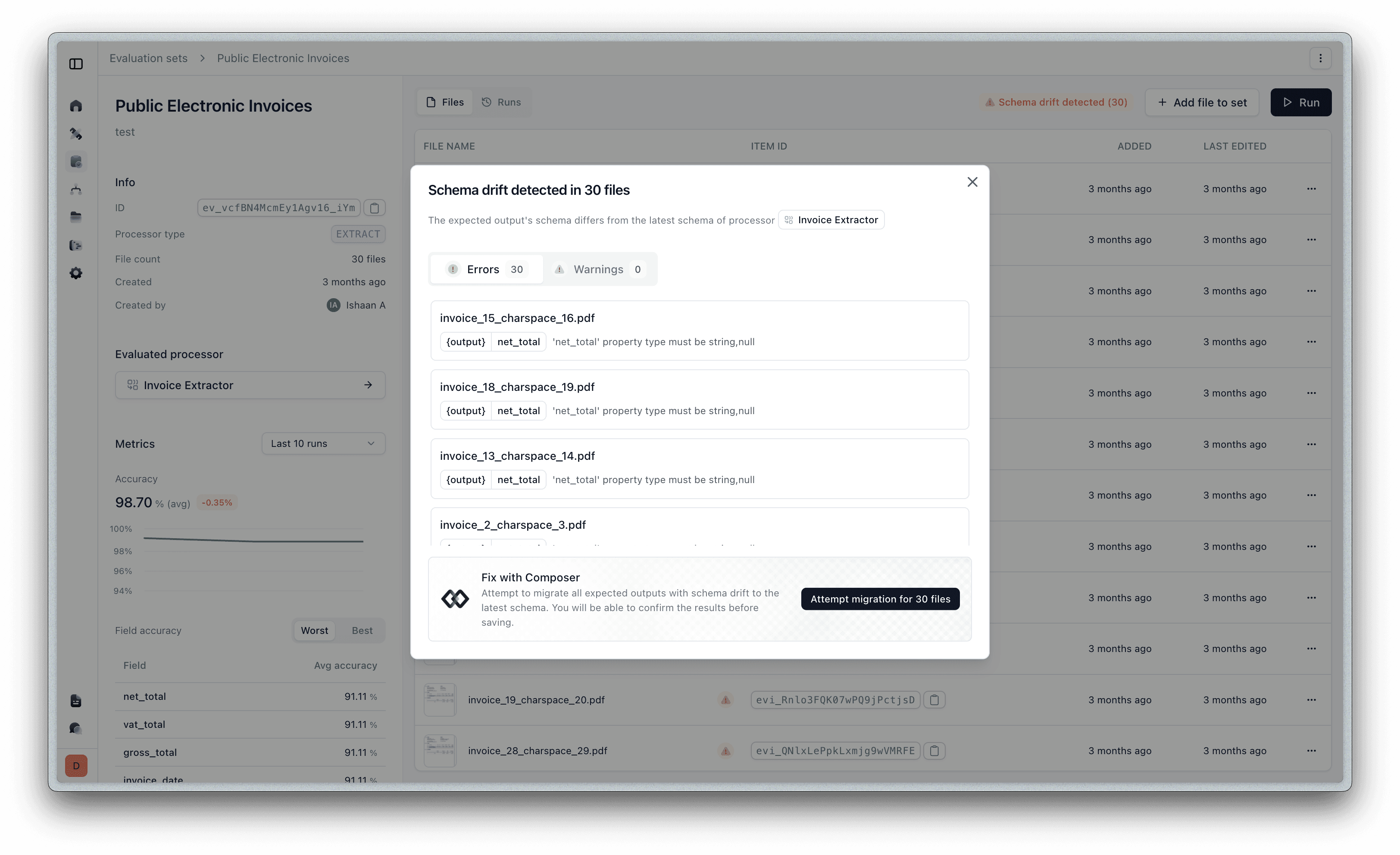 When a structured output schema changes, Composer automatically detects the change, auto-repairs labeled results to match the new schema, and surfaces the re-mapping for review and approval.