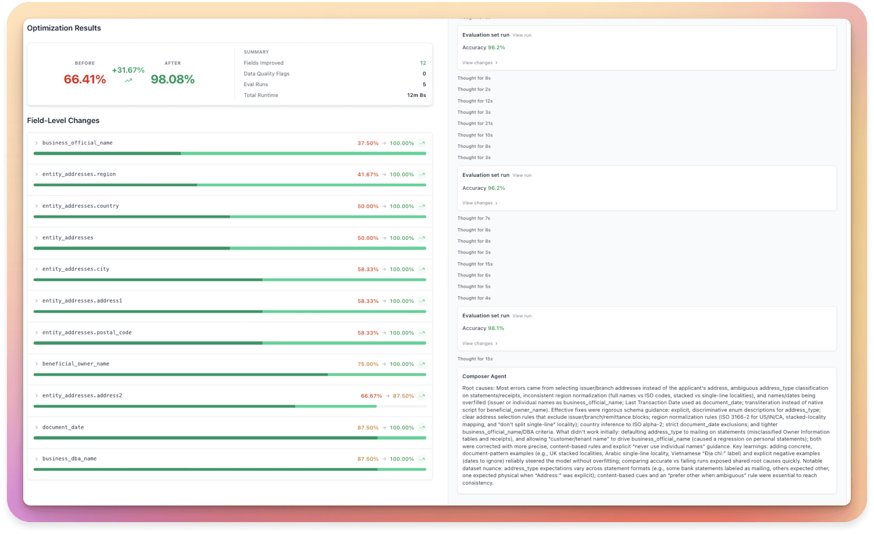 Composer is an AI agent that learns from your documents and optimizes your schemas automatically. Instead of tuning prompts by hand, simply point Composer at your eval set within Extend. Composer analyzes where the current schema falls short, proposes targeted improvements, and evaluates multiple experiments in parallel. Learn more about Composer here!
