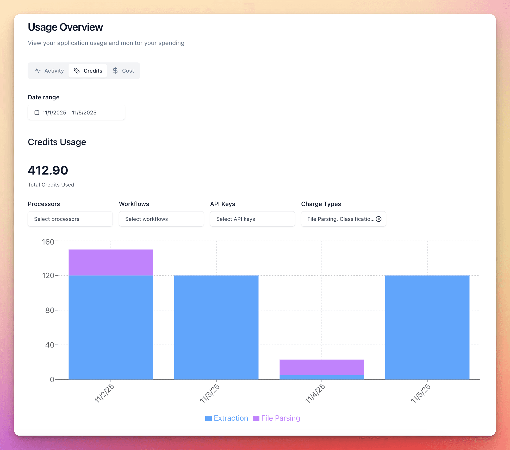 Get detailed insights into your credit usage with new charts and views. View credit costs on individual run detail pages, and filter by API keys, workflows, and more.