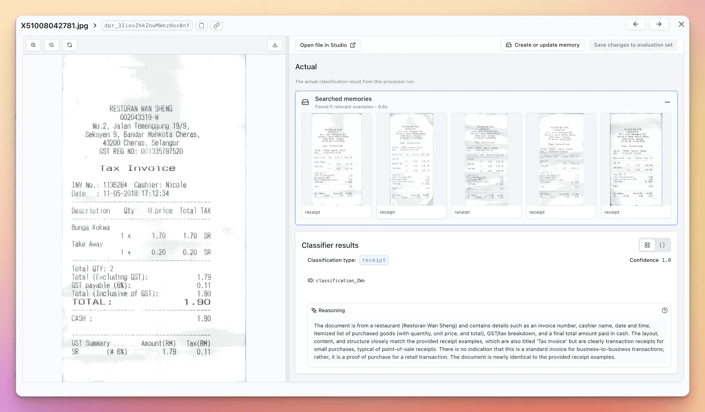 Memory is a multimodal retrieval system that stores representations of how documents were previously classified, split, or extracted. When a new document arrives, Memory retrieves the most visually similar examples and uses them to guide processing decisions. Memory scales naturally as you process more documents, adapts to new formats as examples accumulate, and requires no special tuning or maintenance.