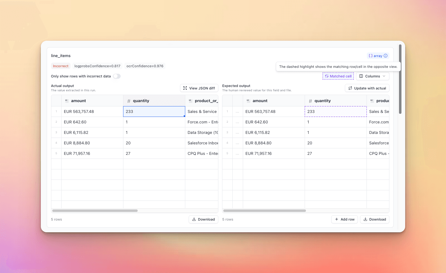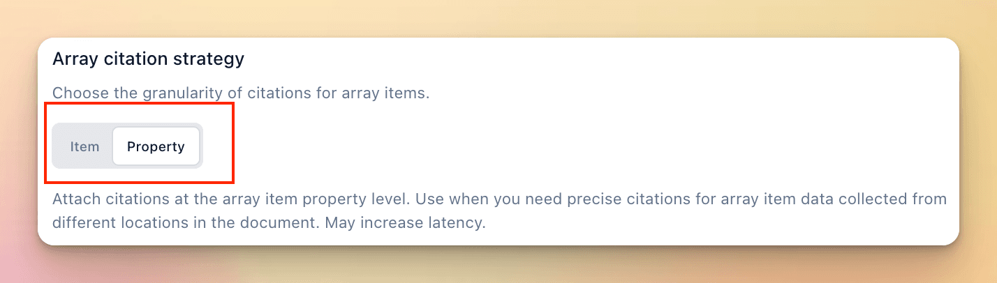 You can now configure the granularity of citations for extracted arrays, with the ability to choose between item or property level citations. Item level citations are the default and will return a citation for each item in the array. Essentially "row" level citations if extracting from a table. Property level citations will return a citation for every leaf property of every item in the array. Essentially "cell" level citations if extracting from a table.