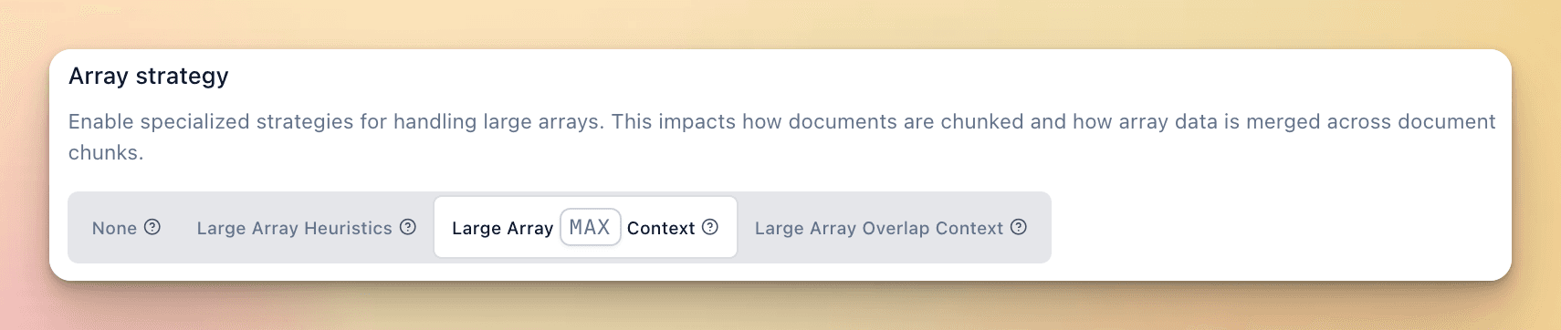 More precise control over behavior of array extraction to impact chunking/merging across large documents for large array extraction. Use MAX context and Overlap Context strategies to consistently handle page-break/table-splitting issues and maximize your large array extraction accuracy.