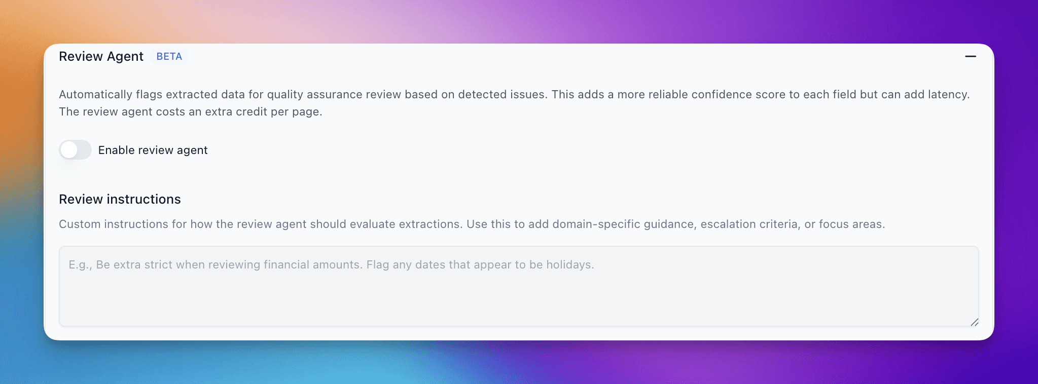 Review Agent automatically detects and scores issues in extraction by reviewing extractions with a critical lens. It flags potential problems such as rule following, ambiguous responses, incorrect extractions, and more, on a confidence scoring of 1-5. The agent is driven by an ensemble of different metrics to provide a reliable measure of extracted data confidence.