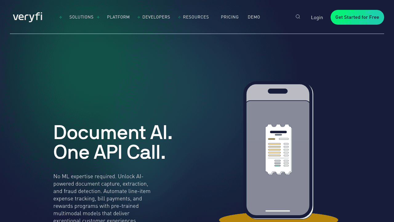 Veryfi provides a cloud-based OCR API designed for financial data and mobile capture. It emphasizes speed and privacy by avoiding human-in-the-loop verification in its pipeline.